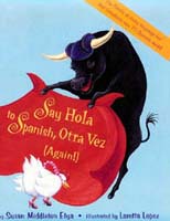 "This second volume by the creators of Say Hola to Spanish introduces 70 . . . vocabulary words strung together by sing-song rhymes and acted out by a menagerie of comically dressed critters. The teaching technique, largely dictated by what completes the rhyme, combines forthright word identification along with those learned in context by examining picture clues. For example, accompanying an illustration of a marching band and a scissor-wielding mouse are the words: "Musicians are músicos. Flags are banderas. Please don't run when using tijeras." Many definitions are clear from the graphic interpretations, but others may require reference to the glossary at book's end. The playful design scatters the text throughout Lopez's gouache and colored-pencil two-page spreads; the most effective scenes group the words thematically, such as a train, plane, bus, and truck approaching the village. Lopez provides images bound to aid early elementary students' retention and recall of these Spanish words."